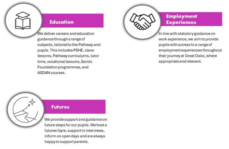 Welcome to the Careers and Futures section of our school website. At Great Oaks School, we are committed to helping every student prepare for adulthood and gain confidence in their future opportunities. Our Careers and Futures Programme aims to equip pupils with the foundational knowledge, skills, and experiences to make informed choices about their next steps in education, employment, and independent living.