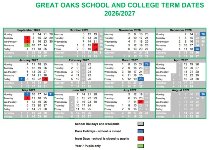 Term Dates and School Hours School starts at 8.50am Monday to Friday and finishes at 3.10pm At Great Oaks we...EncourageAt Great Oaks we...InspireAt Great Oaks we...Support